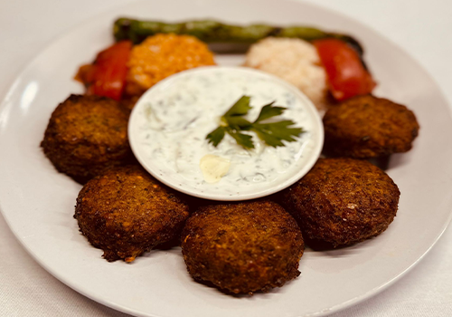 Fresh Zucchini, cheese, parsley, carrots, eggs and herbs blended then pan seared, topped with cacik sauce, served with salad.