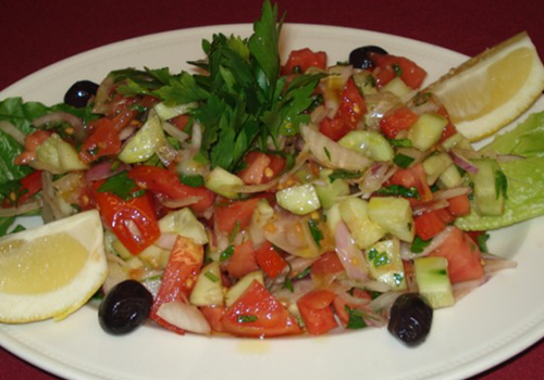 (shepherd salad) Chopped tomatoes, cucumbers, onions, and parsley in lemon juice and olive oil dressing.